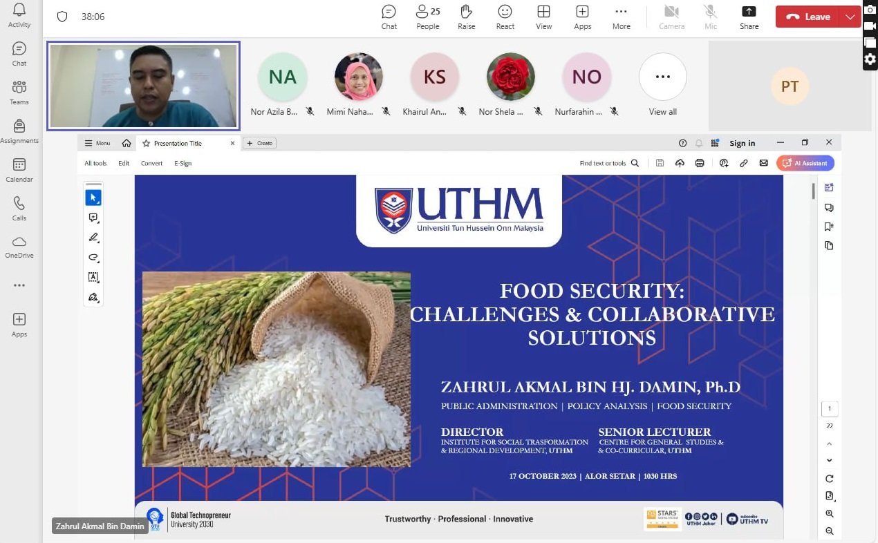 Institut Transformasi Sosial dan Pembangunan Wilayah (TRANSFORM), Universiti Tun Hussein Onn Malaysia (UTHM) telah menganjurkan Sesi Perkongsian "Food Security: Challenges & Collaborative Solutions" pada 11 Julai 2024. Sesi perkongsian ini dijalankan secara atas talian melalui platform Microsoft Teams dan telah disampaikan oleh Dr. Zahrul Akmal bin Damin, Pengarah TRANSFORM UTHM. Seramai 63 orang peserta yang turut hadir dalam menjayakan sesi perkongsian ini. Semoga dengan perkongsian ini dapat memberi manfaat dan kebaikan untuk semua peserta.